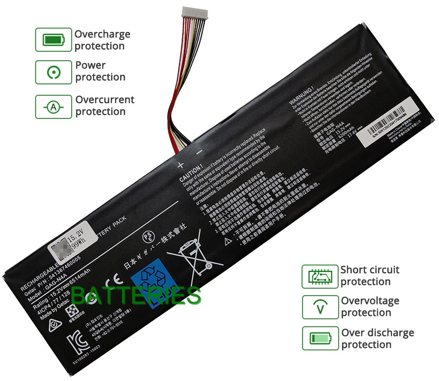 - Notre batterie GIGABYTE AORUS 15G YC-8FR2450SH contient des cellules de batterie de qualité A pour assurer une durée de vie de la batterie plus longue et plus de cycles de charge.