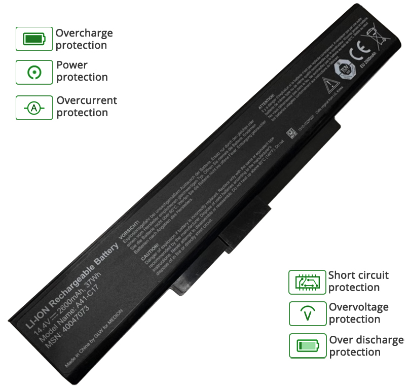 - Notre batterie MEDION A41C17 contient des cellules de batterie de qualité A pour assurer une durée de vie de la batterie plus longue et plus de cycles de charge.